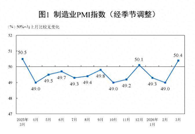 智通财经APP获悉,3月31日,国家统计局公布2026年3月中国采购经理指数运行情况。数据显示,3月份,制造业采购经理指数(PMI)为50.4%,比上月上升1.4个百分点,高于临界点,制造业景气水平回升;非制造业商务活动指数为50.1%,比上月上升0.6个百分点,高于临界点,非制造业景气水平有所改善;综合PMI产出指数为50.5%,比上月上升1.0个百分点,高于临界点,表明我国企业生产经营景气水平总体向好。