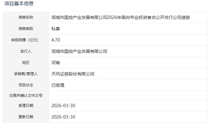 【大河财立方消息】3月31日消息,项城市国控产业发展有限公司2026年面向专业投资者非公开发行公司债券项目获深交所受理。本期债券拟发行金额4.7亿元,承销商/管理人为天风证券。